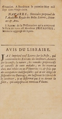 Dissertation sur les causes et la nature de la peste, : qui a remporté le prix à l'Academie Royale des Belles Lettres, Sciences & Arts de Bordeaux, pour l'année 1722. / Par Mr. Pestalozzi.