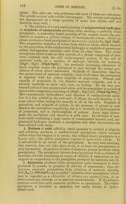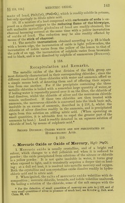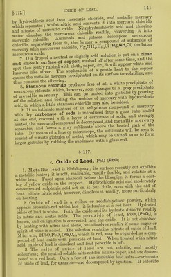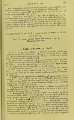 ![For the sake of greater clearness and ^^Pli^J^; J^S' «f crrnxm into two classes, and clistmguisn, _ oxjdes hydrochloric acid, viz., oxide of *r~Tof ;^?c^ilble by hydrochloric acid vi., iS'SS^Ji^a-it'^o^Lpd^ ^^^s it efcting its perfect separation from the oxrdes of the second division. Special Reactions of the more common Oxides of tlie fifth group. First Division : Oxides which are precipitated by Hydrochloric Acid. § 115. a. Oxide of Silver, AgO [Ag.O]. 1. Metallic silver is white, very lustrous, moderately ha^^^^^ malleable rather difficultly fusible. It is not oxidized by fusion m the Til Nitkc^^^^^ dissolves sHver readHy ; the metal is insoluble m ddute sidphuric acid and in hydrochloric acid. ., • + u„„^fVo-r 2 Oxide of silver is a grayish-brown powder ; it is not altogether insoluble in water, and dissolves readUy in dilute nitric acid^ It forms no hydrate. Both the oxide and the peroxide of silver, AgO, [Ag.O.I, are decomposed by heat into metallic silver and oxygen 3 The^alts of oxide of silver are non-volatde and cota- less • but many of them become black on exposure to light. iJie soluble neutra salts do not alter vegetable colours, and are decomposed at ^^Sulphuretted hydrogen and sulphide of ammonium yield a precipitateof black sulphide of silver, AgS [Ag,S], which is insoluble in dilute acids, alkalies, alkahne sulphides, but soluble m cyamde of potassium. Boihng nitric acid decomposes and dissolves this precipitate readily, with separation of sulphur. ■ j.r. c ^ 5. Potassa and soda precipitate oxide of silver m the form of a grayish-brown powder, which is insoluble in an excess of the precipi- tants, but dissolves readily in ammonia. i 6 Ammonia, if added in very small quantity to neutral solutions, throws down the oxide as a brown precipitate, which readily redissolves in an excess of ammonia. Acid solutions are not precipitated. 7 Hydrochloric acid and soluble metallic chlorides produce a white curdy precipitate of chloride of silver, AgCl [AgCl] It the solutions are very dilute, however, there is merely a bluish-wlute opales- cence at first; but on long standing in a warm place the cUoride of silver collects at the bottom of the vessel. By the action of light, the white chloride of silver loses chlorine, first acquiring a violet tint, and ulti- mately turning black; it is insoluble in nitric acid, but dissolves readily in ammonia as ammonio-chloride of silver, from which double compound](https://iiif.wellcomecollection.org/image/b21966953_0163.jp2/full/800%2C/0/default.jpg)