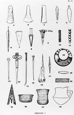 Credit: M0015034: Illustration of Bronze Age Period II implements, ornaments and pottery. Source: Wellcome Collection.