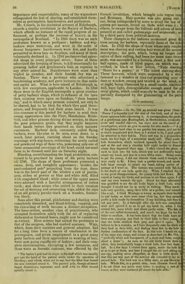 ![/ h h ath; but it becomes tn^fch greaterjvhen ascfndlng in- lined surfaces, snails c]imbiiJf/pie sides aMnllSand lountains. thes^ciiyiyi^pnces tjfrspf'ed is iminished, ^ul is expended in lising the body/iipwhrds. DuHng this period^ the umber of respirations, as well as the nunj^r^T-pul- itions of the heart in a second, augmen^f pid a .•eling of languor and fatigue comiWn4erugs~ta. the iedestrian th© conviction thatHra. ha|5loh^as much cork as his'system will aust'ftin-trtOiout^aJ^cr over] itigue, and ,top ^reat h prostration oystPMfcth^-a cop- ition from Vfiick it ofteqjakes '^fr’T/r^Sir ruit. On th&otfreKjjand, a dip>^xe5«se of muscular ction in walkings r>f?tA^saryT^vta;have already seen, > the healthy and vlgotgiis j^^ot the several organs if the human body. BARBERS AND SURGEONS. Ve are but too apt to overlook the slow and silent peration of the great principles upon which what is low known as the science of political economy are pftnded, although they are sutficiently curious and bvious, even in matters which might be deemed too igh or too low to be thought within their influence, ’hey prevail unconsciously in the progress of society com a low to a high state of civilization; and the t ainted pole and decayed teeth which formerly desig- ated and ornamented the barber’s shop, offer an ex- inplification of the results of a division and union of mployments, interesting enough to justify a short mtice of their history. It is a remarkable fact that the curative art, an art o highly beneficial and even necessary to the well- leing of mankind, should for a very lengthened period iiave existed entirely or chiefly in a merely auxiliary tate. Without going into any historical proofs, we nay state that in the earliest times it was auxiliary to he priesthood. Tn the middle ages it was practised >y females of the highest classes, and, perhaps as a emnant of these ages in our own country, to a com- >aratively recent time, few villages were without their ,ady Bountiful, who by their simples and specifics dleviated or aggravated, as it might happen, the ail- nents of the confiding rustics. The union of the barber with the surgeon is not Tery distinctly traced. The Egyptian priests, it would ippear, shaved, and in the legislation of Moses (Levi- mus, chap, xiv.) concerning leprosy, the treatment of vhich disease was intrusted to the priests, he directs, >n the recovery of a leper, that the head, eyebrows, and leard should be shaved. This could hardly be done jy the patient himself. Civilization, however, gradu- ally rendered the medical an independent, instead of in auxiliary art. Amongst the Greeks and Romans here were eminent medical practitioners; but in the East, where science dawned, but never attained its ze- nith. the medical profession was, and yet is, commonly united with that of the bath-keeper and the barber. In he middle ages of Europe it again merged into the priesthood, and monks and friars, with a few Jews, the disciples of the Arabians, were the general possessors jf the healing art. But here superstition produced the same effect, for a time, that civilization would have more beneficially effected. In 1163 the Council of Tours prohibited the clergy 10m performing any operations in which there was loss of blood. Surgery was also banished from the universities, under the pretext that the church held in ibhorrence all kinds of bloodshed. This separation vas the more readily effected in consequence of the jarbers and bath-keepers having assumed the practice jf surgery. In France the Company of Barbers was formed in 1096, when William, then Archbishop of Rouen, pro- hibited the wearing of the beard. The bath-keepers, who pretended to much medical knowledge, by pre- paring medicated baths suited to different diseases and constitutions, and also by previously preparing the body by laxatives and venesection, shared with the bar- bers for a long period the practice of the healing art. Meanwhile the mists of the middle ages were gradu- ally dispersing, and surgery, illumined by the science of anatomy, began its progress towards a new and brilliant position. The profession of the barber, in the course of time, combined the art of the chirurgeon with the craft of the perruquier. In France the barbiers-cliirurgiens were separated from the barbiers-perruquiers in the time of Louis XIV., and made a distinct corporation. The barbers of London were first incorporated by King Edward IV., 1461, and at that time were the only per- sons who exercised the art of surgery. But this con- solidation of the two crafts could not be permanent. The gradual increase of wealth and luxury created a demand for superior skill in every department of me- dical and surgical science, and the consequence was, that persons of superior attainments began to apply themselves more to actual observation, and the acqui- sition of practical knowledge by a more careful study of the human body, and surgery was more enriched by the single discoveries of close observers than by all the preceding centuries of theory. These persons formed themselves into a voluntary association which they called the Company of Surgeons of London. The efforts of this association eventually effected the sepa- ration of the two crafts. By an Act passed in the 32nd of Henry VIII. these two companies were united and made one body corporate by the name of the Barbers and Sur- geons of London, but it is remarkable that this nominal incorporation was their virtual separation, for the bar- bers were not to practise surgery further than the draw- ing of teeth, and the surgeons were strictly prohibited from exercising the feat or craft of shaving. This dis- junct alliance continued till the year 1745, when, by an Act passed in the 18th of Geo. II., the barbers and sur- geons were disunited and made two distinct corpora- tions. Prior to this, however, many of the barbers, notwithstanding the legal prohibition, continued the practice of phlebotomy and the