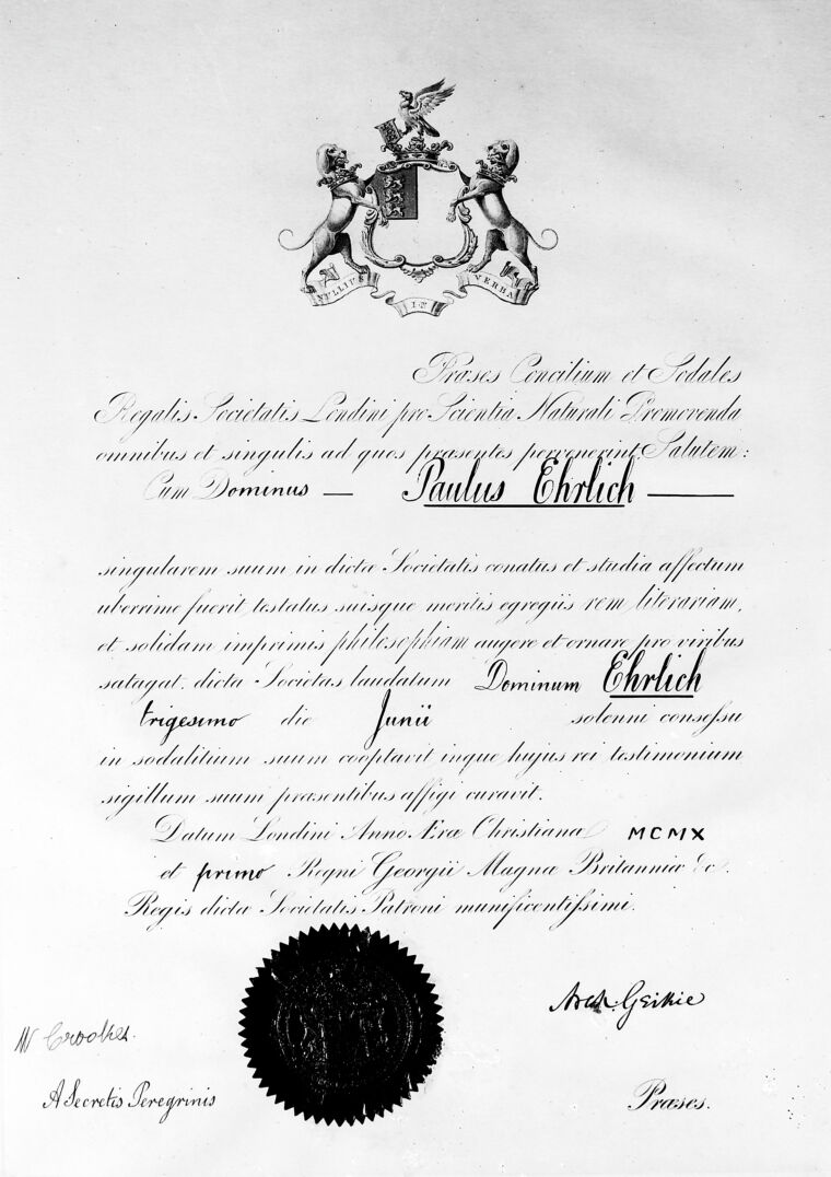 M0013456: Diploma of a foreign member of the Royal Society awarded to Paul Ehrlich. In copyright. Source: Wellcome Collection.