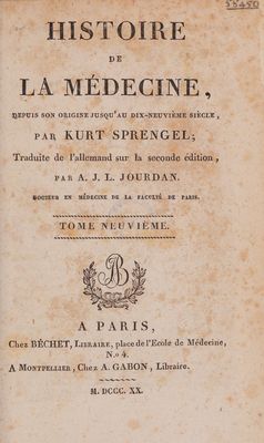 Histoire de la médecine : depuis son origine jusqu'au dix-neuvième siècle / par Kurt Sprengel ; traduite de l'allemand sur la seconde édition par A.J.L. Jourdan, et revue par E.F.M. Bosquillon.