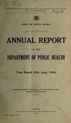 ![[Advance Extract from the volume of “ Annual Departmental Reportx” for the period 1923-24.]P« (o / 0 UNION OF SOUTH AFRICA ANNUAL REPORT X OF THE DEPARTMENT OF PUBLIC HEALTH Year Ended 30th June, 1924. j ' j, ^ , . i Published under Authority, and Presented to both Houses of Parliament PRETORIA The Government Printing and Stationery Office 1924 8123—20/11/24—700](https://iiif.wellcomecollection.org/image/b31477057_0001.jp2/full/800%2C/0/default.jpg)