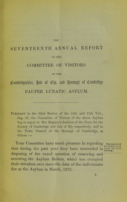The seventeenth annual report of the Committee of Visitors of the Cambridgeshire, Isle of Ely and Borough of Cambridge Pauper Lunatic Asylum : for the year ending the thirty-first day of December, 1874, with appendices.