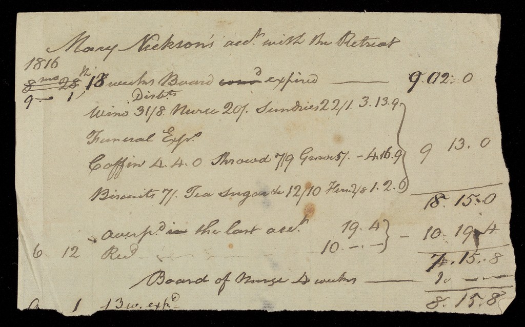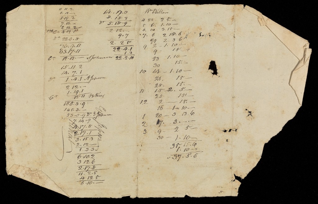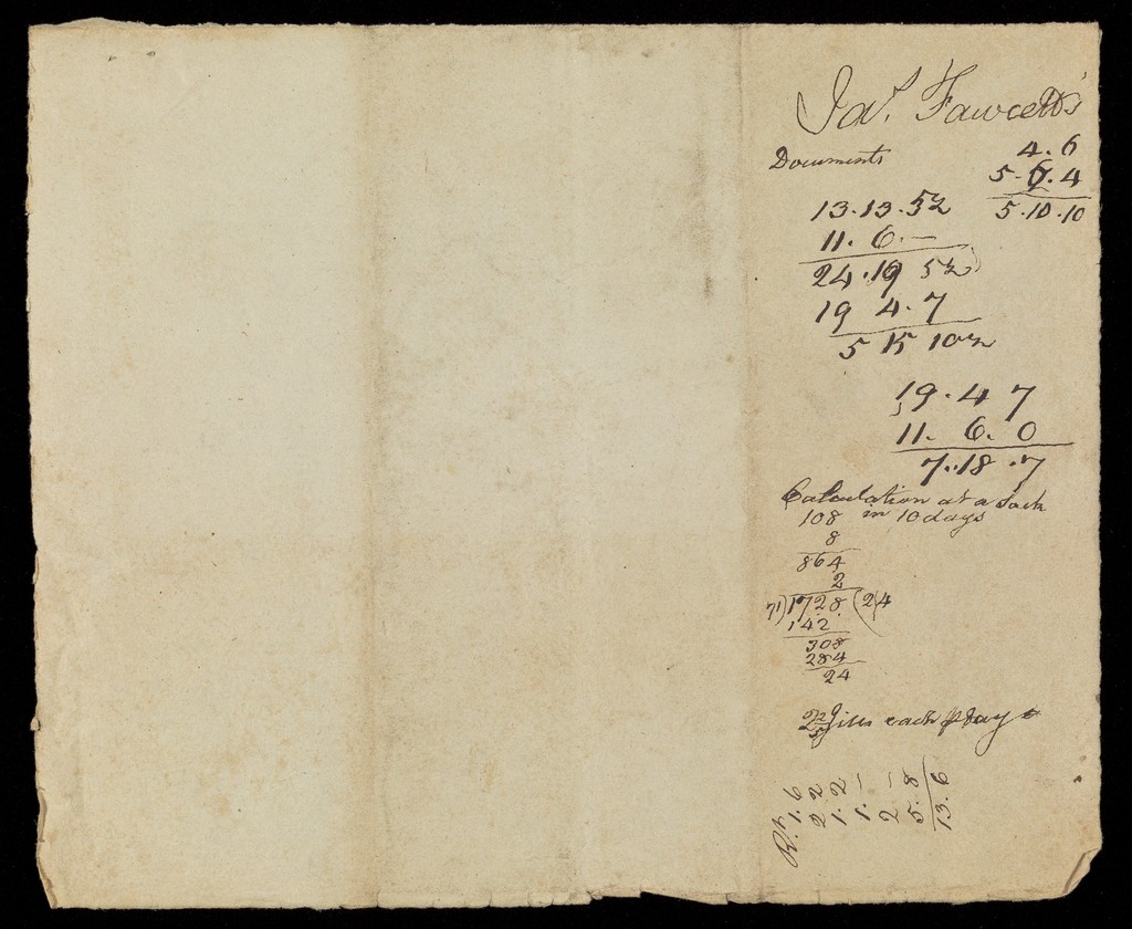 Credit: Scraps of accounts, including patients' accounts, sums, an old 1811 accounts wrapper which is a re-used Leyburn auctioneers bond, doodles etc. Source: Wellcome Collection.
