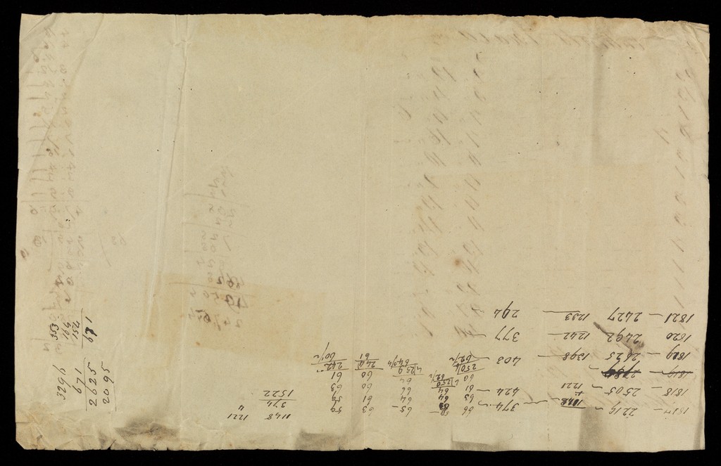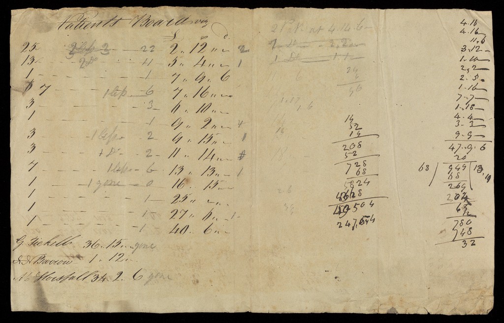Credit: Scraps of accounts, including patients' accounts, sums, an old 1811 accounts wrapper which is a re-used Leyburn auctioneers bond, doodles etc. Source: Wellcome Collection.