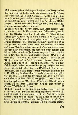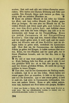 ![werben. Unb will eud) «Ifo mit foId)en ifrcmplen unters ridjten. tPir I^ßben »on Christo 0rbnung unb €el?r unb nemlid), Pein (Bewalt, binsu nod) bßmon 5U tbun, bies felbig trifft ein jeblidjen VHenfeben nn. K! VS JDenn ein jebUtber tlTenfd) ift fid) felbe ber Hdibfte bey (ßott; unb b«tt »ollen (ßewdt fein Öndjen gegen (Bott 5U fertigen. 0o nun aber ber tTEenfd) ber ift, ber fold)en (Bewalt au0 feiner <^(xnt> gibt, unb bebalt bae nit, bae ibm (Bott geben b<ttt, unb beftldjtö einem anberen, unb fudjt ibn beim felbigen: je^t fallt er in bie Zeremonien unb b«ngt an ber t>er5wcifflung. JDenn ein feblid) Ceremonia ift ber t)er3weifflung Zrotten^. XTun folgt au0 bem, bieweil foldjer (Bewalt au0 ber ^anbt geben wirb, fo wirb aud? au0 ber <^ani>t geben ber (Blaube unb all feine Urdffte: unb im fels bigen baljin ee geben wirb, »erftefjnbt bie Zeremonien auff. JDae ftnb je§ bie Ceremoniae, ein dufferlicben 0^ein 3U geben ben (Dingen, fo babin vertraut finb wors ben. 2)enn, ber ben (Blauben au0 ber ■^anb gibt, ber ift feines (Blaubens beraubt, unb ber l)(tt ibn, bem er ibn geben bnt. VS 00 viel er nun bran au^5utbcilcn bnt, fo viel sablt er. JDiefe 5«blung ftebt bey (Bott, es gelt fo viel, fo viel fein gbttlid)er tPill fey: ob es bo0 ober gut fey, ftanb aud) bey feinem gbttlicben tPillen. £r wirbt bie ^^ergen anfeben in benen 2)ingen. K! Uun aber, ba0 id) ben Zeremonien ein 2luftrag ma(bt, fo wiffenbt, ba0 fte fe nit fein foUen. 2Denn fjeibm wir etwas gegen (Bott 5U erwerben, fo ftebt er bie i^eröen, unb nit bie Zeremony. >^(it er uns etwas geben, fo will er aud) nit, baß wirs in Ceremoniis »erbrau<ben, fons bem mit unferer “Jlrbeit. (Denn er gibt nichts onbers, benn bas, barburd) wir (Bott lieben von ^er^en, Urdfften 1) WoI;l »on (Trotte = 'i^elter, (Drt wo ber Wein iurd; (treten ge; vreßt trirö. Vgl. bas> altl)oä}beutfä)e trotton [= treten] ober bas fp4tmittel^od;6eutfd?e trotten [= laufen].](https://iiif.wellcomecollection.org/image/b24867330_0414.jp2/full/800%2C/0/default.jpg)