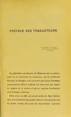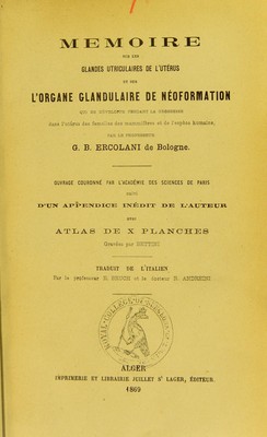 Mémoire sur les glandes utriculaires de l'utérus et sur l'organe glandulaire de néoformation qui se développe pendant la grossesse dans l'utérus des femelles des mammifères et de l'espèce humaine / par G.B. Ercolani ; ... suivi d'un appendice inédit de l'auteur avec atlas de X planches gravées par Bettini ; traduit de l'italien par E. Bruch et R. Andreini. [Texte].