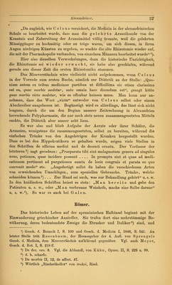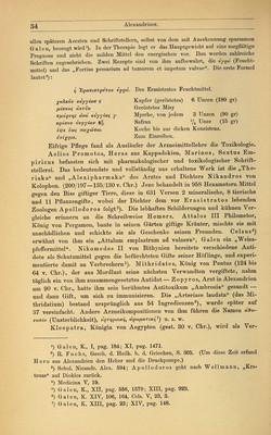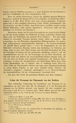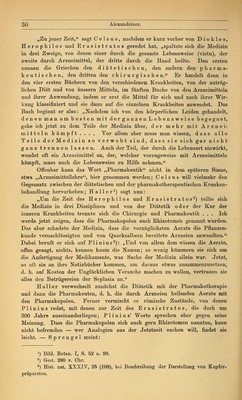 ![Keimblätter und Geschlechtsorgane kennt er nicht; die Nerven Ift? (teils Bast- bündel, teils Blattrippen) und die Adern (hauptsächlich Milchsaftgefässe), sowie das Mark und Holz bezeichnet er als innere Teile der Pflanze; auch die Adventivknospen ogot, kennt er1). Seine wichtigsten auf uns gekommenen Werke sind: Historia plantarum, De causis plantarum, De lapidibus, De igne. Alexandriner. Griechenland kam nach der Schlacht bei Chäronäa 338 unter die Herrschaft Philipps von Makedonien, nach dessen 336 erfolgtem Tode der junge Alexander die Zügel der Regierung ergriff. Auf seinem siegreichen Zuge zur Verwirklichung des Planes, das Griechentum in alle Länder und zu allen Völkern zu tragen, fiel ihm Aegypten ohne einen Schwertstreich zu; dafür schonte er aber die Eigenart der Bewohner in Sitten und Religionsgebräuchen, richtete eine weise Regierung ein und gründete die Hauptstadt Alexandria. Ihre günstige geographische Lage, die Entwickelung eines blühenden Handels mit der Anhäufung von Reichtümern, die Berührung griechischer Bildung mit der alten Kultur Aegyptens, die Begeisterung hochgesinnter Fürsten für Kunst und Wissenschaft machten die Stadt zum Anziehungs- und Brennpunkte für das geistige Leben, für Handel und Verkehr. Zu den hier gepflegten Fächern gehörte nicht an letzter Stelle die Medizin und besonders die Arzneimittellehre, die durch eine Reihe von Rhi- zotomen sehr gefördert wurde. Unter den Aerzten nimmt Herophilos (300 v. Chr.) die erste Stelle ein. Welchen Wert er und seine Nachfolger auf die Arzneimittel legten, sagen C e 1 s u s 2) und Plinius3). Ferner sind zu nennen Mantias (250 v. Chr.), Verfasser von ntgi xa&aQTixrjg i] ngonoTiOfxcov jj xXvßfA,<3v, Abführmittel, Tränke oder Klistiere, dwd- /utis, Mittel, cpctQ/LiaxonwXijs 6 xca' latgilov, der Arzneihändler im Iatreion u. a., die Grälen aufzählt und besonders sein pharmakologisches Werk rühmt4); Demetrios, Verfasser einer Arzneimittellehre „Pharmakopoles, Andreas von Karystos mit seinem Hauptwerke „Narthex5), Apollonius Mys (200 v. Chr.), der eine „Prophylaxis gegen Gifte und „Euporista, Hausmittel, schrieb, Io 1 as von Bithynien und Hera- kleides von Tarent (über die Bereitung und Prüfung der Arzneimittel6). Era- sist ratos, dessen Bedeutung für die Weiterentwickelung der Heilkunde von fast nirgends den Aristoteles nennt, ist er in den Verdacht des Plagiators gekommen. Wie er die Erbschaft benutzt hat, steht dahin. Dieselben Titel bei verschiedener Grundanschauung wären ja leicht erklärlich. Das Ausarbeiten von Entwürfen und die Benutzung der Kollektaneen war sein Recht. Ob Aristoteles alle seine Werke selbst verfasst hat, ist sehr fraglich; wahrscheinlich hat er auf ihm ferner hegenden Gebieten den Grundgedanken gegeben und den mit den Spezialgebieten vertrauten Schülern (Assistenten) die Ausführung überlassen. *) Hist. pl. I, 8 (4). 2) Medicina, Praef.: „Sie heilten keine Krankheit ohne Arzneimittel. 3) Hist. nat. XV, 5 (15): Herophilus clarus medicina, a quo ferunt dictum, quasdam (seil, herbas) fortassis etiam calcatas (wenn man darauf träte) prodesse. 4) Galen, K., XI. pag. 795. 5) Id. 1. c. 6) Diosc. mat. med. praef. Berendes, Das Apothekenwesen. g](https://iiif.wellcomecollection.org/image/b21033973_0049.jp2/full/800%2C/0/default.jpg)