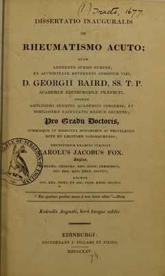 Credit: Dissertatio inauguralis de rheumatismo acuto ... / eruditorum examini subjicit Carolus Jacobus Fox. Source: Wellcome Collection.