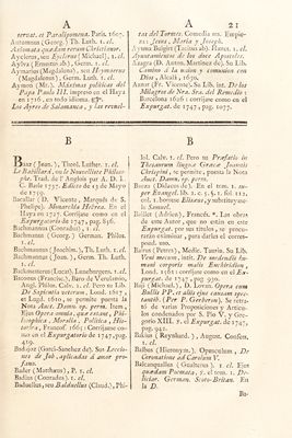 ![Bala’us Sudovolca,seu Sudo¡vogius[]o^i\.) Scriptor Britan. i.cL Baldaiius ( Theophil. ), Germ. Th. Luth, 1. c¡^ Balduinus (Balthasar), Germ. Luth. i. cL Balduinus ( Francisc. ) , Jurisc. Ejas Consíantiniís Alagnus , sive de Cons- tantini Imperat. legib. Ecclesiast. atque Civilib. Commeyitaria. Balduinus (Fridcric.), Th, Luth. i. cL Balingius ( Nicolaus), i. el. BaUistarius (Joan.) Non illc Cathalanus, ex Carmelit, Familia, qui scripsit su~ per Sententías , anno 1574; sed alius Hseretic. i. cL Baltanás (Fr. Domingo), Historia de los Santos Padres del Testamento Viejo. Balthasar Cppius. i. el. f. Copias, &c. Balticus (Martin.) Theol. Bojus, et Phil. Luth. i.cl. Bamsoviüs (Samuel), Germ. Hist. Luth, I. el. Bank (Laurent.), Roma trimnphans, seu aetus inaii^iirationis et eoronationis lytnoeen. X. P ont. Max .Y 1645. Bandart (Guillaume). Su Lib. intit. Les Guerres de Nassau. A Ainsterd. 1616, En Flamenco, Bandemburchius (Adrián, seu Hadrian.)y Ultraject. Th. et Poeta Calv, Zuingl. I. el. Pero se permiten con la Nota al Aut. y á la Obra las sigg. I,aiides, Híeronyma> Columna et Ascanii Col. cum ejusdem Adriani Miscellaneis Poematis. Typ, Plantini. z;:: Nota ad Libros 4. Pet^i Apollonii Collatii , de Txeidio Hierosolymit. rr! Emenda-' tiones adValeriiim Máximum. . . Bangarensis (Robersonus), i. el. Bangius (Thomas), Calv. i, el. Bannosius (TheoJor.), Theol. i. el. Bannosius , seu Banosius (Theophil.), Histor. et Polit, Calv. i. el. Baptismo de fuego del Amor Divino ^ para mayor honra y gloria de Dios'. y acaba : Viva Jesús, viva Aíaríi ^vi- va Joseph , Trinidad amorosa , y se-^ lio de mi eorazon Papel en una fbxa, impr. en Sevilla y otras Ciudades, en 1730. prohibido en todo idioma. Barba (Pompelus). Su Lib. De Seeretis natura. Barbarosa (Christophor.) , Germ. Th. Luth. Philol. I. el Barbeyrac ( Jean ) , f, Samuel Puffen- dorf. Barclay (Roberto). Apología de la ver- dadera Jheologia Christiana, como es profesada y predicada por el Pue- blo de los Teynbladores. i. tom. en Loodr. 1710. Edicto de 6. de Jun. de Barclajus (Joan.), 6 con nombre fingido , Eiiphormio Lusininus. Ejus Satyri- con , tiene que expurgar, f. el Ex- purgat. de 1747 , pag. 746, Pero otra parte de dicha Obra , int. (fuinta \ Al- t i poli veritatis lachryma ^ sive Eu- phormionis Lusinini eont inuatio, Rho- ton. 1628. Amstel. 1618. Leydac 1628 ;se prohibe.como igualmenr. los dos libr. sigg. Lletas , sive publica pro Regib. ac Principib. et privatis pro Guillermo Barclajo pareyite vin- dicia adversus Robert. Card, Bellar- min. tractatum de Potestate Siimmi Pontif. in rebus temporalibus. Item, Joan. Barclaii Argenis cum clave , hoc est , nominiim propriorum eliici- daiione. Amstelod. Barclajus (Wilhielm.). Su Lib. De Po- testate Summi Pontifeis, contra Be- ll armin. Barcos (Martin de), Francés, de Bayona. Las obras de este A. que no están en este Expurgaty por sus títulos, se procurarán examinar para su corres- pond. uso. Bardagi (Ibandiis de). En Sus Comenta- rios in I^eges et fora Aragonía , fol. 297 , donde habla de la Concepción de la vir2;en María , bórrese Eccle- sia ; y donde dice inepté loquitur Jot- rese inepte. Barents (Arent.) , i. el. Bareth (Guilielm.). i. cL Barreira (Joan de) Re por torio de Tiem- pos , Coimbra 15 79 y 1582 ; Corríjase como en el Expurg.at. de 1747 , pag.](https://iiif.wellcomecollection.org/image/b28776586_0072.jp2/full/800%2C/0/default.jpg)