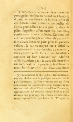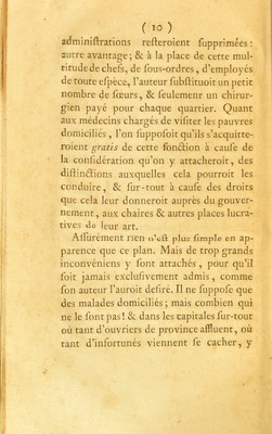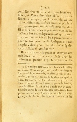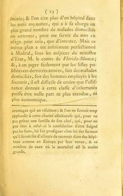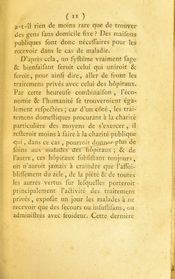 ![N Dans un ouvrage publié il y a peu de temps, à Paris, ]e me fouviens d’avoir vu le fyftême des traitemens domeftiques pro- pofé comme le feul convenable aux pauvres. D’après les vues exclufives de l’auteur, plus d’hôpitaux, par conféquent plus de grands bâtimens à conftruire ou à entretenir ; & cet article feul augmenteroit de plus d’un tiers les fonds immédiatement applicables au foulagement des malades ; les grandes & dans tout le cours de cet ouvrage, eft non-feule- ment un devoir d’humanité, mais encore une des obligations les plus précifes de la fociété envers quelques-uns de fes membres à quf ellÉ' doit tout quand îl«- panier»* -pluiT rien. Je ne dis point ceci pour ôter aux gouvernemens le mérite qu’il y a à s’occuper de la charité publique ; au contraire, leur parler de leurs devoirs c’eft leur montrer, linon les feuls, au moins les titres les plus folides de leur gloire. Tout ce que je veux, c’eft que le pauvre accepte, & jouilTe, fans crainte d’humi- liation, des fecours que la charité vient lui offrir ; & pour cela il faut bien qu’il fâche qu’il a des droits à ces fecours.](https://iiif.wellcomecollection.org/image/b21945779_0013.jp2/full/800%2C/0/default.jpg)