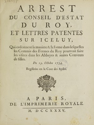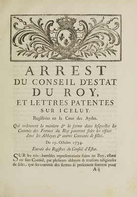 Credit: Arrest ... et lettres patentes ... qui ordonnent la manière & la forme dans lesquelles les Commis des Fermes du Roy pourront faire les visites dans les abbayes & autres convents de filles. Du 19 oct. 1734. Source: Wellcome Collection.