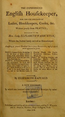 The experienced English housekeeper : for the use and ease of ladies, housekeepers, cooks, &c., written purely from practice; dedicated to the Hon. Lady Elizabeth Warburton, whom the author lately served as housekeeper. consisting of several hundred original receipts, most of which never appeared in print ... / by Elizabeth Raffald.