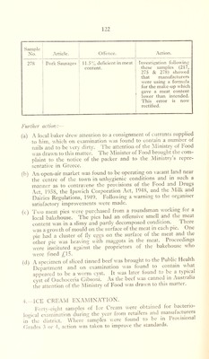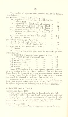 ![I he number of registered food premises, etc., in the borough is as follows:— ° (a) Section 14, Food and Drugs Act, 1938. (i) Preparation or manufacture of pickled or pre- served food ... ... ... 21 (ii) Preparation or manufacture of sausages or potted, pressed, pickled or preserved food ... 84 (iii) Manufacture, Storage and Sale of Ice Cream ... 6 (iv) Wholesale Storage and Sale of Ice Cream ... 2 Iv) \\ holesale and Retail Storage and Sale of Ice Cream ... ... 1 (\*0 Retail Storage and Sale of Tee Cream ... 214 fvii) Boiling ot Shellfish ... ... ]q (b) Ipswich Corporation Act, 1948. (j) Hawkers of Food—Section 126 ... ... 58 (ii) Vendors of Shellfish- Section 127 ... ... 24 (c) Milk and Dairies Regulations, 1949. (i) Dairies ... ... ... ... 21 1 he following inspections were made of registered premises during the year:— (i) Preparation or manufacture ot sausages or potted pressed, pickled or preserved food ... 227 (ii) Ice Cream premises ... ... ... 208 (iii) Shellfish Boilers ... ... ... ... 27 (iv) Shellfish Vendors ... ... ... 9 (v) Hawkers of Food ... ... ... 47 (vi) Dairies ... ... ... ... j23 During 1953 condemned food was disposed of mainly by burial on a Corporation refuse tip. Some condemned food was however disposed of to the destructor works, and a certain amount used in the processing of waste food for pig food. The destructor works will not he available for disposal ot condemned food during 1954. A summary of the foodstuff's condemned as a result of damage by Hood waters is given in the report on the flooding which occurred on the night of 31 January-lst February, which appears on page 127. 6. DISEASES OF ANIMALS. Tuberculosis Order, 1938. Three cows were slaughtered in the Borough under this Order. During the year two calves were found, on post-mortem inspection at a slaughterhouse, to be affected with congenital tuberculosis. Details were sent to the local Veterinary Inspector of the Ministry of Agri- culture and Fisheries for his information and further action Anthrax Order, 1938. No cases of suspected Anthrax were reported during the year.](https://iiif.wellcomecollection.org/image/b29496184_0128.jp2/full/800%2C/0/default.jpg)