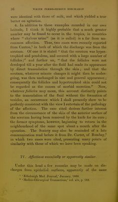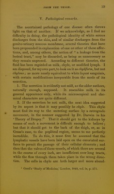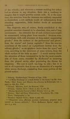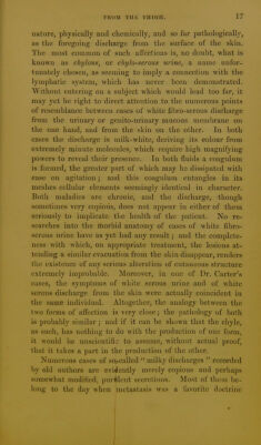 ![]5 eflusiou from the skiu^ iu this cusc froui a female subject, occurred in the north of France. It is referred to by Haller, in his ' Physiology/ The description by Dr. Bour- don being short, may be translated in full.' I have met, in the course of my practice, with a young ■woman twenty years of age, from the upper part of whose left thigh as much milk is discharged by small pustules over the pubes, and even upon the labia vulvae, as a nurse could supply from her breasts. This milk yields butter, curd, and serum, like cow's milk, from which it only differs by a sensible acrimony perceived by the tongue in tasting it. The thigh from which it flows is much swollen, and the oedema, which is unaccompanied with pain, is relieved and diminished in proportion to the amount of the discharge. Sometimes it runs so profusely that the patient has to keep the part bandaged, with firm compresses over the pustules, in order to check it, inasmuch as the abimdant loss proves ex- tremely exhausting. The patient is well formed, with a suffi- cient amount of embonpoint, and with her breasts proportion- ately developed. At seven years white menstrual discharges made their appearance, and have since continued regular, both in quantity and quality. But for the last seven or eight months, if I mistake not, since this milk has begun to flow, she has not menstruated. Except for the exhaustion which has been mentioned, her health is good. 3. A somewhat similar case, not, however, said to have been chronic, and of which the history is very imperfect, is mentioned by Dr. llommel.^ A woman who was nursing twins began to complain, a few days after the death of one of them, of a sense of dull pain and tension beneath the ribs on the right side of the abdomen, and over the um- bilicus. This feeling was succeeded by itching, the itching by scratching, and the scratching by an exudation of fluid from the skin, the colour, taste, and consistence of which 1 Extrait d'une Lettre a M. Lemery, par M. le Dr. Bourdon ^ Ciimbrai, contenant quelque chose de fort singulier; 'Journal de S(;.ivans,' June 5, 1684.](https://iiif.wellcomecollection.org/image/b21477036_0019.jp2/full/800%2C/0/default.jpg)