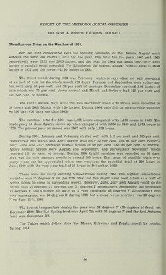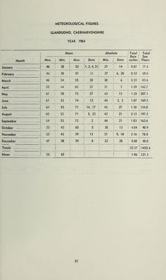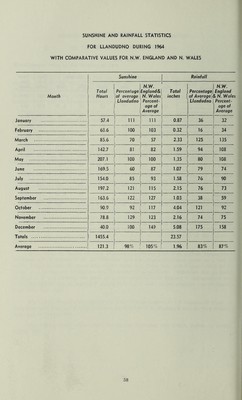 ![SUNSHINE AND RAINFALL STATISTICS FOR LLANDUDNO DURING 1964 WITH COMPARATIVE VALUES FOR N.W. ENGLAND AND N. WALES Month Sunshine Rainfall Total Hours I Percentage of average Llandudno 1 1 N.W. England& N. Wales Percent- age of Average Total inches Percentage of Average]i Llandudno N.W. England & N. Wales Percent- age of Average January 57.4 111 | 111 0.87 36 32 February 63.6 100 1 103 0.32 16 34 March 85.6 1 70 57 2.33 125 135 April 142.7 | f 81 82 1.59 94 108 May 207.1 | f ico 1 100 1.35 80 108 June 169.5 60 i 87 1.07 79 74 July 154.0 1 85 93 1.58 76 90 August 197.2 l 121 115 2.15 76 73 September 163.6 j i 122 1 127 1.03 38 59 October 90.9 1 1 92 117 4.04 121 92 November 78.8 | | 129 123 2.16 74 75 December 40.0 | 100 149 5.08 175 158 Totals 1455.4 23.57 1 Average 121.3 i 98% 105% 1.96 83% 87%](https://iiif.wellcomecollection.org/image/b29691151_0072.jp2/full/800%2C/0/default.jpg)