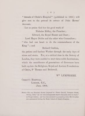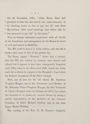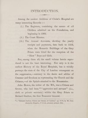 John Howes' ms., 1582 : being "a brief note of the order and manner of the proceedings in the first erection of" the three royal hospitals of Christ, Bridewell & St. Thomas the Apostle / Reproduced and printed at the charges of Septimus Vaughan Morgan, Esq., a governor of Christ's Hospital ; with introduction and notes by William Lempriere.