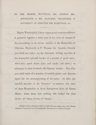 Credit: John Howes' ms., 1582 : being "a brief note of the order and manner of the proceedings in the first erection of" the three royal hospitals of Christ, Bridewell & St. Thomas the Apostle / Reproduced and printed at the charges of Septimus Vaughan Morgan, Esq., a governor of Christ's Hospital ; with introduction and notes by William Lempriere. Source: Wellcome Collection.