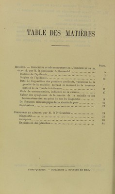 ![TABLE DES MATIÈRES Hygiène. — Conditions du développement de l'épidémie et de sa GRAVITÉ, par M. le professeur P. Brouardel 5 Histoire de l'épidémie ^ Origine de l'épidémie * Date de l'apparition des premiers accidents, variations de la gravité de la maladie suivant le moment de la consom- mation de la viande trichineuse j] Mode de consommation, influence de la cuisson 17 Valeur des symptômes de la marche de la maladie et des lésions observées au point de vue du diagnostic 18 De Texamen microscopique de la viande de porc 20 Conclusions , 22 Symptômes et lésions, par M. le Dr Grancher 29 Diagnostic 35 Autopsies 38 Explication des planches , 44 SAINT-QUENTIN. — IMPRIMERIE J. MOUREAU ET FILS,](https://iiif.wellcomecollection.org/image/b22272951_0052.jp2/full/800%2C/0/default.jpg)