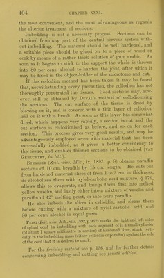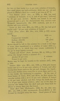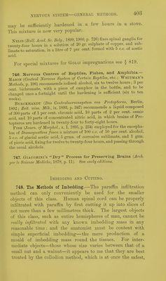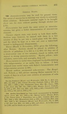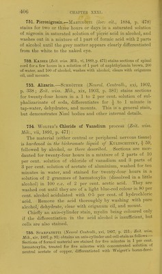 ![751. Picronigrosin.^MARTiNOTTi {loc- cit., 1884, p. 478) stains for two oi' three hours or days in a saturated solution of nigrosin in saturated solution of picric acid in alcohol, and washes out in a mixture of 1 part of formic acid with 2 parts of alcohol until the grey matter appears clearly differentiated from the white to the naked eye, 752. Kaiser {Zeit. wiss. Mik., vi, 1889, p. 471) stains Bections of spinal cord for a few hours in a solution of 1 pai-t of naphthylamin brown, 200 of water, and 100 of tilcoliol, washes with alcohol, clears with origanum oil, and mounts. 753. Alizarin.—Scheottee [Neurol. Centralh., xxi, 1902, p. 338; Zeit. wiss. Mik., xix, 1903, p. 381) stains sections for twenty-four hours in a 1 to 2 per cent, solution of sul- phalizarinate of soda, differentiates for ^ to 1 minute in tap-water^ dehydrates^ and mounts. This is a general stain, but demonstrates Nissl bodies and other internal details. 754. Woltee's Chloride of Vanadium process {Zeit. wiss. Mik., vii, 1891, p. 471) : The material (either central or peripheral nervous tissue) is hardened in the hichrornate liquid of Kultschitzky, § 59, followed by alcohol, as there described. Sections are mor- danted for twenty-four hours in a mixtu.re of 2 parts of 10 per cent, solution of chloride of vanadium and 3 parts of 3 per cent, solution of acetate of aluminium, washed for ten minutes in water, and stained for twenty-four hours in a solution of 2 grammes of hsematoxylin (dissolved in a little alcohol) in 100 c.c. of 2 per cent, acetic acid.. They are washed out until they are of a light blue-red colour in 80 per cent, alcohol acidulated with 0-5 per cent, of hydrochloric ' acid. Remove the acid thoroughly by washing with pure alcohol, dehydrate, clear with origanum oil, and mount. Chiefly an axis-cylinder stain, myehn being coloured only if the differentiation in the acid alcohol is insufficient, but cells are also stained. 755. ScAEPATETTi (Neurol Centralh., xvi, 1897, p. 211; Zeit. toiss. Mi]c.,xiv, 1897,p.91) obtains an axis-cylinder and cell-stain as follows:— Sections of formol material are stained for fire minutes in 1 per cent, hematoxylin, treated for five minutes with concentrated solution of neutral acetate of copper, difeerentiated with Weigert's borax-fern-](https://iiif.wellcomecollection.org/image/b21462586_0420.jp2/full/800%2C/0/default.jpg)