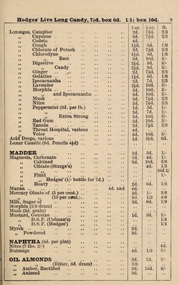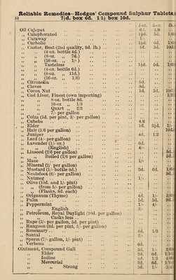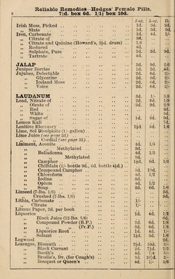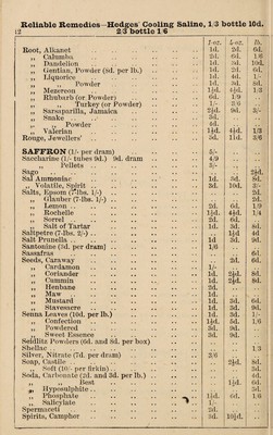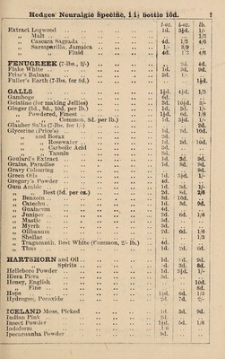 Credit: W. R. Hedges' pocket price list of genuine drugs, chemicals, patent medicines, perfumes, soaps, toilet requisites, domestic & dietetic articles, foreign mineral waters, &c. Source: Wellcome Collection.