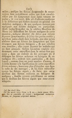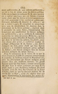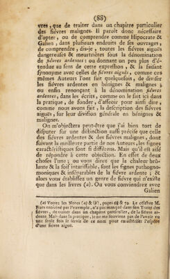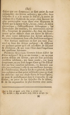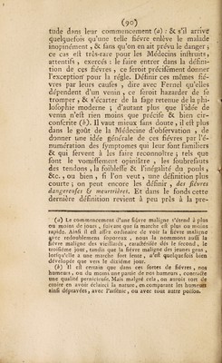 ![SsGONpE Q.ÎJSSTXON. 1dolt^clle entrer ] dans la définition des fièvres malignes 5 aiiifi que la contagion ? Dans le nombre de nos Auteurs , il y en ^ a quelques-uns 5 des Allemands fur-tout 5 qui font | entrer l’épidémicité dans la définition des fièvres I malignes , & qui lemblent par conséquent n’en 1 point reconnoître de fporadiques. En quoi je penfe | iqu’iis fe trompent Sort. Selon eux les fièvres « malignes font des fièvres épidémiques meurtrières^ î qui font accompagnées de iymptomes particuliers ^ qui leur font familiers 5 & qui ne s’obiêrvent pas dans les fièvres épidémiques bénignes. S’il y a donc des fièvres fporadiques pareillement rneurtrières ; en proportion du nombre des malades qu’elles j attaquent , & qui par leurs Iymptomes fo . rap^ ^ portent évidemment aux fièvres épidémiques ma^ j lignes ; il paroît nécefîaire de caraéïérifer les pre^ ^ rnieres par la même épithete. Or l’expétience joui> nalière me paroît démontrer qu’il y a efieftive- ment de telles fièvres ; que les lymptonies qui ^ caraftérifenî les fièvres épidémiques malignes , & qui les diifinguent des lièvres épidémiques bé- - nlgnes 5 font précifément les mêmes qui carafté-? rilènt nos fièvres Iporadiques dangereufes & meur- trièree , & les diftinguent des fièvres Iporadiques bénignes» Méconnoître cette vérité c’eft fe réfufor à l’évidence. Par exemple ? je fus appellé le foir du 28 du mois de Juin dernier 5 chez une femme du peuple âgée de 50 à 55 ans j elle étoit malade depuis cinq jours. Elle a voit fur la joue gauche un ^ charbon três-confidérable couvert de puftules ji pleines d’une forofité rougeâtre & tranliiarente» 1 Des environs de ce charbon partoit une enflure oedemateufe & un peu livide , qui s’étendoit fur toute la joue ^ & particulièrement aux paupières](https://iiif.wellcomecollection.org/image/b30511331_0102.jp2/full/800%2C/0/default.jpg)