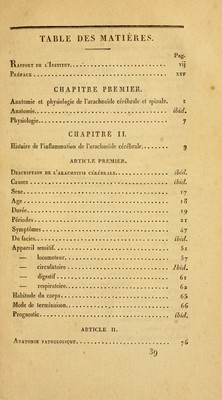 Recherches sur l'inflammation de l'arachnoide cérbŕale et spinale, ou Histoire théorique et pratique de l'arachnitis / par Parent-Duchatelet et L. Martinet; avec un Rapport fait à l'Institut de France par Portal [and others].