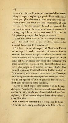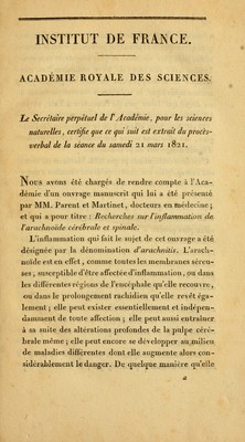 Recherches sur l'inflammation de l'arachnoide cérbŕale et spinale, ou Histoire théorique et pratique de l'arachnitis / par Parent-Duchatelet et L. Martinet; avec un Rapport fait à l'Institut de France par Portal [and others].