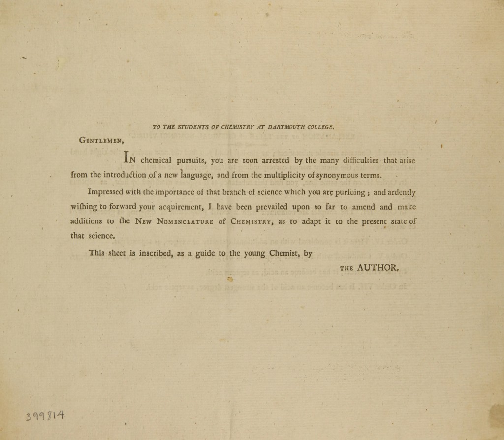 A new nomenclature of chemistry : proposed by Messrs. de Morveau, Lavoisier, Berthollet and Fourcroy ; with additions and improvements / by Lyman Spalding, M.B. ; lecturer of chemistry in Dartmouth University.