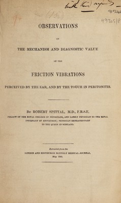Observations on the mechanism and diagnostic value of the fiction vibrations perceived by the ear, and by the touch in peritonitis / [Robert Spittal].