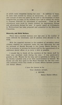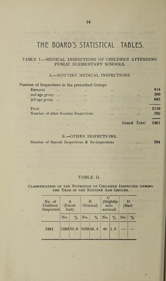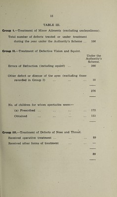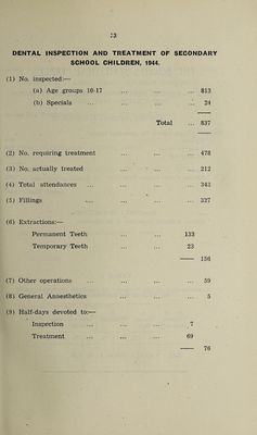 ![TABLE IV.—DENTAL INSPECTION AND TREATMENT (1) Number of Children who were :— Inspected by the Dental Surgeons : (a) Routine Age Groups .. .. 5474 ' (b) Specials .. .. .. .. .. .. 23 (c) Total (Routine and Specials) .. . . 5497 (2) Number Found to require treatment .. .. 2816 (3) Number Actually treated .. .. .. 1688 (4) Attendances made by children for treatment .. 232 6 (5) Half-days devoted to Inspection .. 120 Treatment 472 Total 592 (6) Fillings Permanent teeth.. 1541 Temporary teeth .. 222 Total 1763 / Permanent teeth .. 404 (7) Extractions ] ( Temporary teeth ..2148 Total ... 2552 (8) Administration of general anaesthetics for extractions 19 (9) Other operations Permanent teeth .. 522 Temporary teeth .. 43 Total 565 Table V.—JJncleanliness and verminous conditions. (i) Average number of visits per school made during the year by the School Nuises, 8.8. (ii) Total number of examinations of children in the Schools by School Nurses 26,515. (iii) Number of individual children found unclean, 422. (iv) Number of children cleansed under arrangements made by the Local Education Authority, nil. (v) Number of cases in which legal proceedings were taken : (a) Under the Education Act, 1921, Nil. (b) Under School Attendance Byelaws, Nil.](https://iiif.wellcomecollection.org/image/b30267018_0018.jp2/full/800%2C/0/default.jpg)