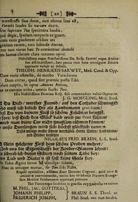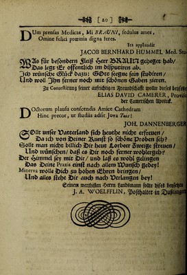 ![•#$3 [ 20 ] g£§~ DUm pxenfas Medicas , Mi BRaUNI% feduius artes, Omine felici praemia digna feres. i ~ Tea applaudit JACOB BERNHARD HUMMEL Med. Stu. QjOSfe fur befbitbem ^letf ^err 2&&2lUn gcl;eget (?<*b/ ^^£>46 kgt t£r offetttitcb tm bt|puttreit <tb. 3ct> wuujcBe cSSucf bujtt: <3<£>cc feegm feti» (Jubtrett/ Urtb woll Jt>n feriter ttocb i«tt (cboitett tSubeit jieren. 3« Conteftirnng feinec mifric&tigen ^ceunbfdjafft rooffte biefei bettfe^e ELIAS DAVID CAMERER, Provifc bee (Samcrift&en aipotwf. DO&ortim plaufu confcendis Amice Cathedram Hinc precor, uc ftudiis adiit Joya Tau i JOH. DANNENBERGER uit|er \?4tterl4ttb ftefe beutbe tttcJjt erfrettett / 2)4 i<h »btt 2>ettter 2U*ttjf |b fcbotte Probeit (et)? Sdlit nt4tt mcbe btUtcb iDtr betit ilorbeer Stvetge (fretiett / Uttb tvutt|cbett/ buf ce iDtr ttocb feriter wbblerSeb* 5Der 3>ttttmel fey mtt 2>ir/ urtb luf ee wobl geltttgett 2)4e iDetrte Praxis etttft ttucb ullern XPuttfeb gebey! Minerva wolle 2>tcb ?u bbbei» t£brcit brtitgett/ Uub 4Uee ffebe iDtr uttcb ttucb Pertattgett bey! ©etitcm roerfbtflen Vertit SanbSmann fonte btfeJ 6et)Me» j. A. woelfflin , ^oftyaltec in 2>uplw0« Ti . '](https://iiif.wellcomecollection.org/image/b30773647_0020.jp2/full/800%2C/0/default.jpg)
