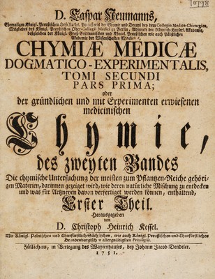 Chymiae medicae dogmatico-experimentalis tomi primi, pars prima [-tomi quarti, pars seconda], oder der gründlichen und mit Experimenten erwiesenen medicinischen Chymie, des ersten Bandes erster Theil [-vierten Bandes ... zweyter Theil] / herausgegeben von D.C.H. Kessel.