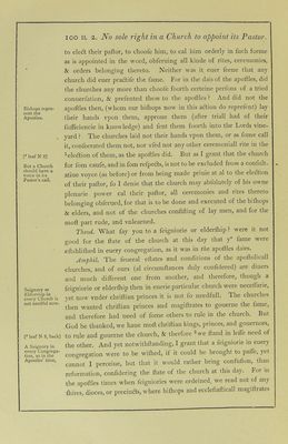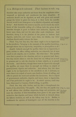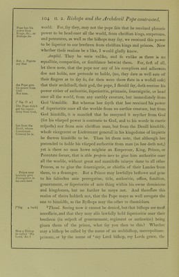 ![Pope has his power from Kings, &c., as Bishops do. But, I. Papists say that the Pope gets his power from God. Not true. 1‘ Sig. O. 4.] The Pope didn’t get his superi* ority from God, but from the Devil, whose Lieutenant- General he is. Prince may lawfully give Prerogative in his own land. t*Sig. 4. back] May a Bishop be called * My Lord,’ &c. ? 104 II. 2. Bishops and the Archdevil Pope contrasted. world. For, fuy they, may not the pope faie that he receiued plenarie power to be head oner all the world, from chriftian kings, emperours, and potentates, as well as the bifliops may fay, we receiued this power to be luperior to our brethren from chriftian kings and princes. Now whether thefe reafons be a like, I would gladly know. Amphil. They be verie vnlike, and fo vnlike as there is no equallitie, comparifon, or femblance betwixt them. For, firft of all, let the;« note, that the pope nor any of his complices and adherents doe not holde, nor pretende to holde, (no, they dare as well eate oft their fingers as to fay fo, for then were there ftate in a wofull cafe) that their archdiuell, their god, the pope, I fhould fay, doth receiue his power either of authoritie, fuperioritie, primacie, foueraigntie, or head ouer all the world, from any earthly creature, but immediately from God ^himfelfe. But whereas hee fayth that hee receiued his power of tuperioritie ouer all the worlde from no earthie creature, but from God himfelfe, it is manifeft that he receyued it neyther from God (for his vturped power is contrarie to God, and to his worde in euerie refpefte) nor from anie chriftian man, but from the Deuill himfelfe, whofe vicegerent or Liefetenant generall in his kingedome of impietie he Ihewes himfelfe to be. Than let them note, that although hee pretended to holde his vfurped authoritie from man (as hee doth not,) yet is there no man howe mightie an Emperour, King, Prince, or Potentate foeuer, that is able proprio iure to giue him authoritie ouer all the worlde, without great and manifefte iniurye done to all other Princes, as to giue the foueraigntie, or chieftie of their Landes from them, to a ftraunger. But a Prince may lawfullye beftowe and geue to his fubieftes anie prerogatiue, title, authoritie, office, function, gouernment, or fuperioritie of anie thing within his owne dominions and kingdomes, but no further he maye not. And therefore this reafon of theirs holdeth not, that the Pope maye as well arrogate the one to himfelfe, as the Byfliops may the other to themfelues. ^Theod. Seeing now it cannot be denied, but that bilhops are moft necelfarie, and that they may alfo lawfully hold fuperioritie ouer their brethren (in refpedt of gouernement, regiment or authoritie) being giuen them of the prince, what fay you then to this? Whether may a bifliop be called by the name of an archbithop, metropolitane primate, or by the name of ‘ my Lord bithop, my Lords grace, the](https://iiif.wellcomecollection.org/image/b24876422_0642.jp2/full/800%2C/0/default.jpg)