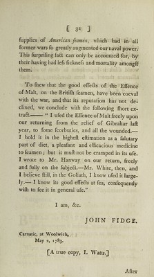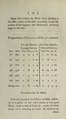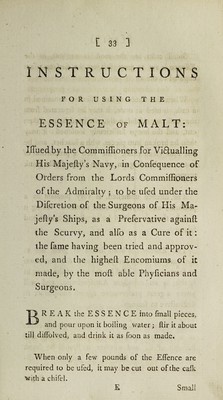 Credit: Official testimonies of the benefits arising from the essence or extract of malt : as used in the British Navy, for making wort at sea consisting of short extracts from the best writers; from medical journals kept on board the King's ships; and from the testimony of surgeons ... / prepared and sold by Holdsworth & Barnard ... under the encouragement and protection of His Majesty's letters patent, granted to the late Mr. Thornton. Source: Wellcome Collection.