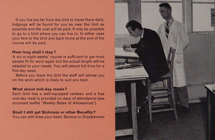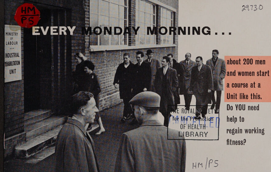 Credit: Every Monday morning... : about 200 men and women start a course at a unit like this : Do YOU need help to regain working fitness? / Prepared by the Ministry of Labour and the Central Office of Information. Source: Wellcome Collection.