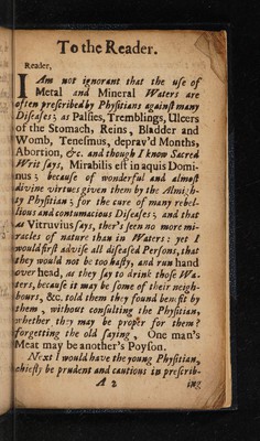 A short treatise of metal and mineral waters; viz. those of the Spaw, Bathe, Epsom, Northhall, Barnet, Tunbridge, and the New Wells at Islington ... / by E.P. [i.e. Ellis Pratt].
