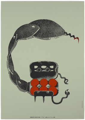 A phone receiver [?] in the form of a creature with tails as antennae, and a body comprising an egg box opened to reveal 6 red eggs as the telephone digits [?]; advertising the danger of AIDS. Colour lithograph by Raúl, ca. 1995.