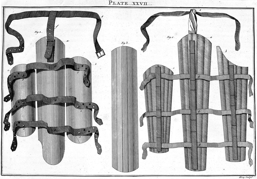 Credit: M0016500: Illustration fo surgical leg splints, 18th century. Source: Wellcome Collection.