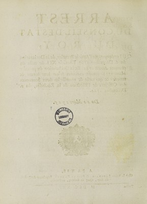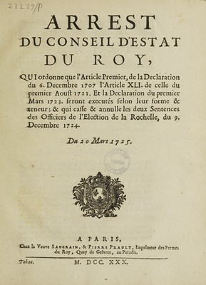 Credit: Arrest ... qui ordonne que l'article I, de la declaration du 6 dec. 1707, l'article XLI, de celle du I aoust 1721 et la declaration du I mars 1723 seront executés selon leur forme & teneur; & qui casse & annulle les deux sentences des offciers de l'Election de la Rochelle, du 9 dec. 1724. Du 20 mars 1725. Source: Wellcome Collection.