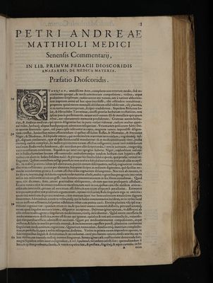 Commentarii in sex libros Pedacii Dioscoridis Anazarbei de medica materia / jam denuo ab ipso autore recogniti, et locis plus mille aucti. Adjectis plantarum, et animalium iconibus, supra priores editiones longe pluribus, ad vivum delineatis. Accesserunt quoque ad margines Graeci contextus quam plurimi, ex antiquissimis codicibus desumpti, qui Dioscoridis ipsius depravatam lectionem restituunt.