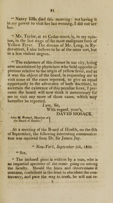 Credit: An account of the malignant fever, which prevailed in the city of New-York, during the autumn of 1805 : Containing, 1. The proceedings of the Board of Health ... : 2. The rise, progress, and decline of the late epidemic : 3. An account of the Marine and Bellevue Hospitals ... : 4. Record of deaths, &c. &c. : 5. Opinion of several eminent physicians, respecting the cause of malignant fever ... : 6. The situation of the convicts in the state-prison ... : 7. Desultory observations andreflections. : 8. The various modes of cure ... / by James Hardie. Source: Wellcome Collection.