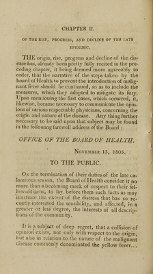 An account of the malignant fever, which prevailed in the city of New-York, during the autumn of 1805 : Containing, 1. The proceedings of the Board of Health ... : 2. The rise, progress, and decline of the late epidemic : 3. An account of the Marine and Bellevue Hospitals ... : 4. Record of deaths, &c. &c. : 5. Opinion of several eminent physicians, respecting the cause of malignant fever ... : 6. The situation of the convicts in the state-prison ... : 7. Desultory observations andreflections. : 8. The various modes of cure ... / by James Hardie.