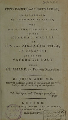 Credit: Experiments and observations, to investigate, by chemical analysis, the medicinal properties of the mineral waters of Spa and Aix-la-Chappelle, in Germany; and of the waters and boue near St. Amand. In French Flanders ... / [John Ash]. Source: Wellcome Collection.