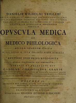 Danielis Wilhelmi Trilleri ... Opuscula medica ac medico philogica / antea sparsim edita nunc autem in unum collecta atque digesta ab auctore ipso prius recognita ... et emendata ; curavit et praefatus est Carolus Christianus Krause.