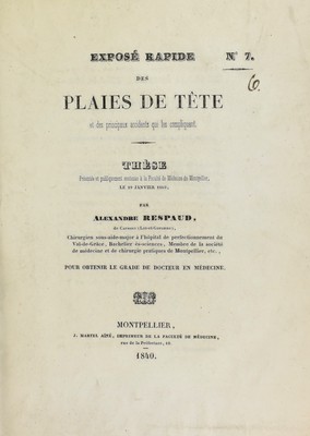 Exposé rapide des plaies de tête et des principaux accidents qui les compliquent : thèse présentée et publiquement soutenue à la Faculté de médecine de Montpellier, le 29 janvier 1840 / par Alexandre Respaud.