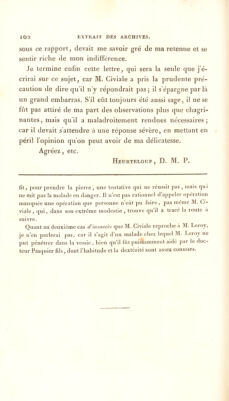 Lettre à l'Académie des Sciences. Examen critique de l'ouvrage de M. le docteur Civiale, intitulé De la lithotritie; ou, Broiement de la pierre dans la vessie, et appréciation des faits présentés. Par ce médecin / [ Heurteloup].