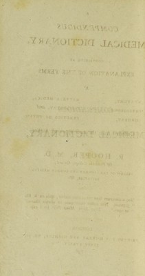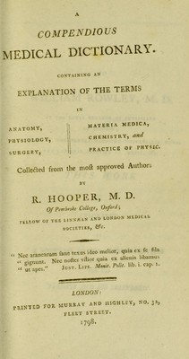 A compendious medical dictionary : containing an explanation of the terms in anatomy, physiology, surgery, materia medica, chemistry, and practice of physic - collected from the most approved authors / by R. Hooper, M.D.