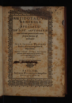Antidotarium generale et speciale : ex opt. authorum tam veterum quàm recentiorum scriptis fideliter & methodicè / à Ioan. Iacobo Weckero ... congestum & dispositum. Nunc verò supra priores editiones omnes multis novis & optimis formulis, maximè verò extractis auctum.